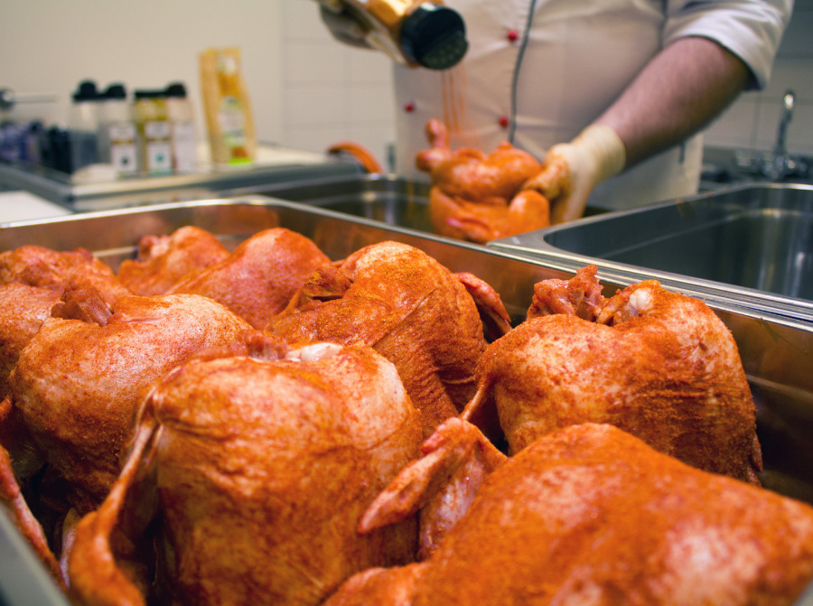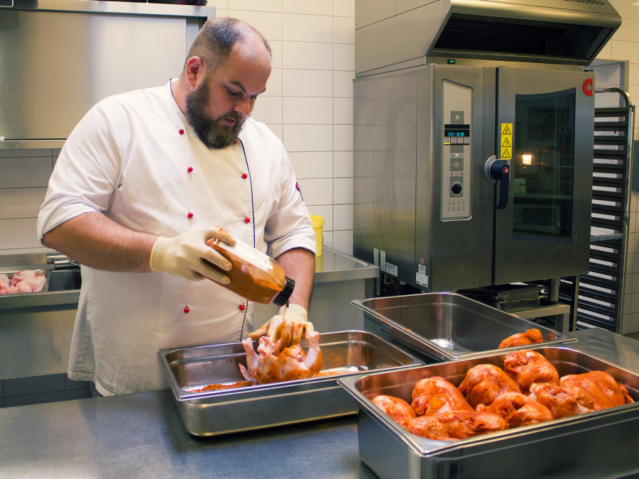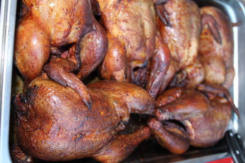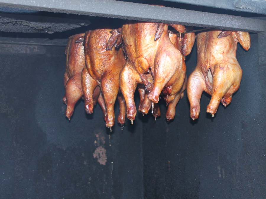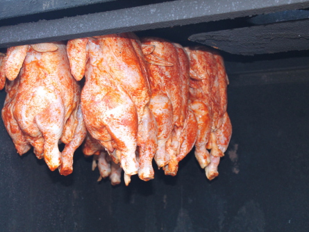 Die Hähnchen werden bei uns in Handarbeit, nach Familienrezept gewürzt. Nach einer gewissen Lagerzeit werden die Hähnchen durch Heißräucherverfahren, über Buchenholz, gegart.